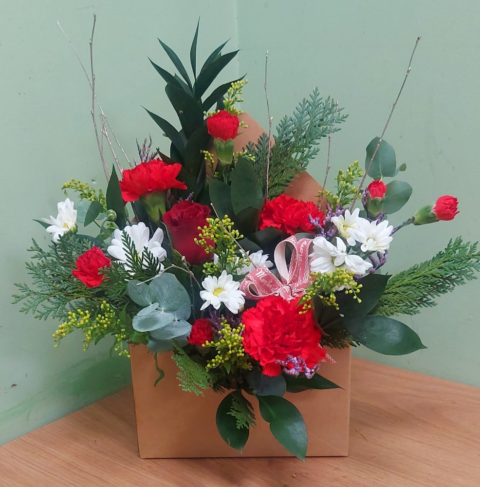 Send festive cheer straight to the heart with Letter to Santa (Red). A charming envelope-style arrangement filled with vibrant red blooms, fresh greenery, and seasonal accents. The perfect way to share Christmas joy in a truly unique design.